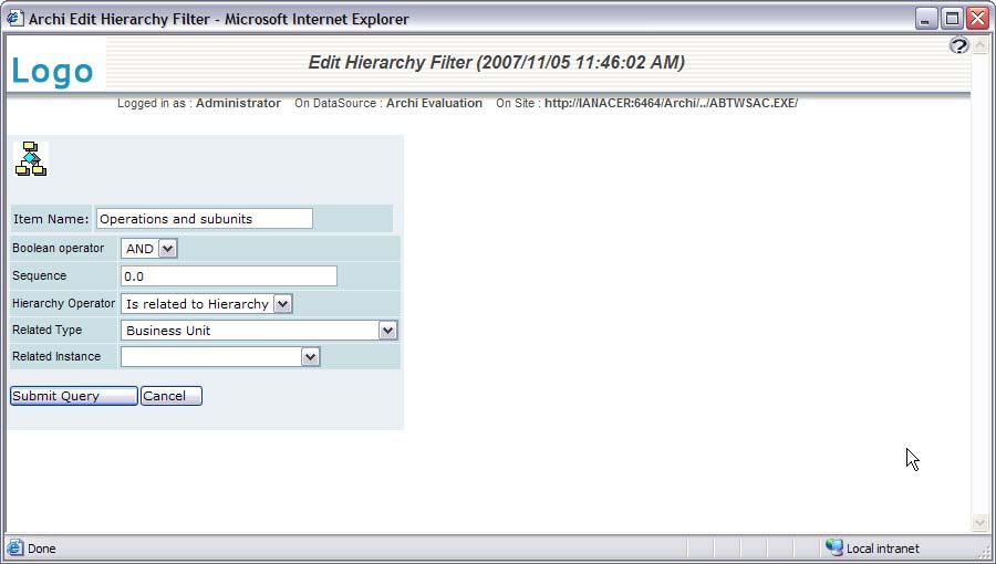 The screen below shows the detail for adding a hierarchy filter condition. You provide a name for the condition, choose the Boolean operator (AND OR) for
