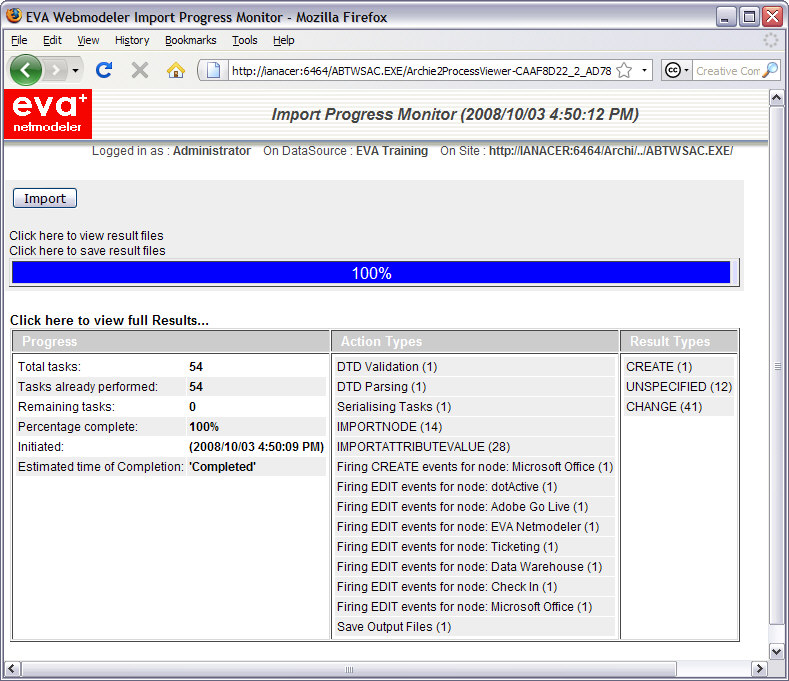 - When the import process is complete, EVA Netmodeler will display the Import Tool Results window similar to the one below.